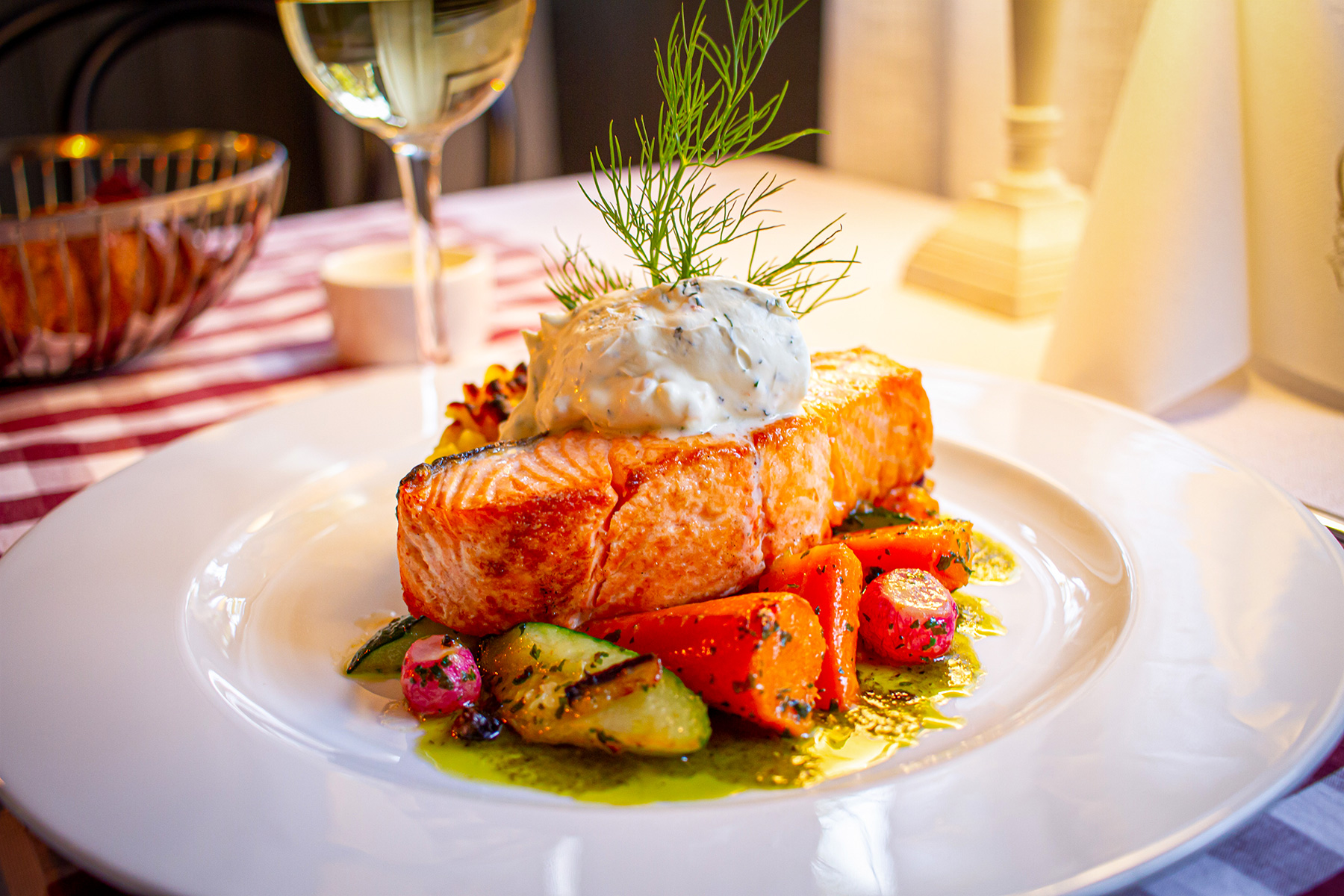 karamellisoitua sipulia, herkkusieniä, timjamiporkkanaa, piparjuurikastiketta,